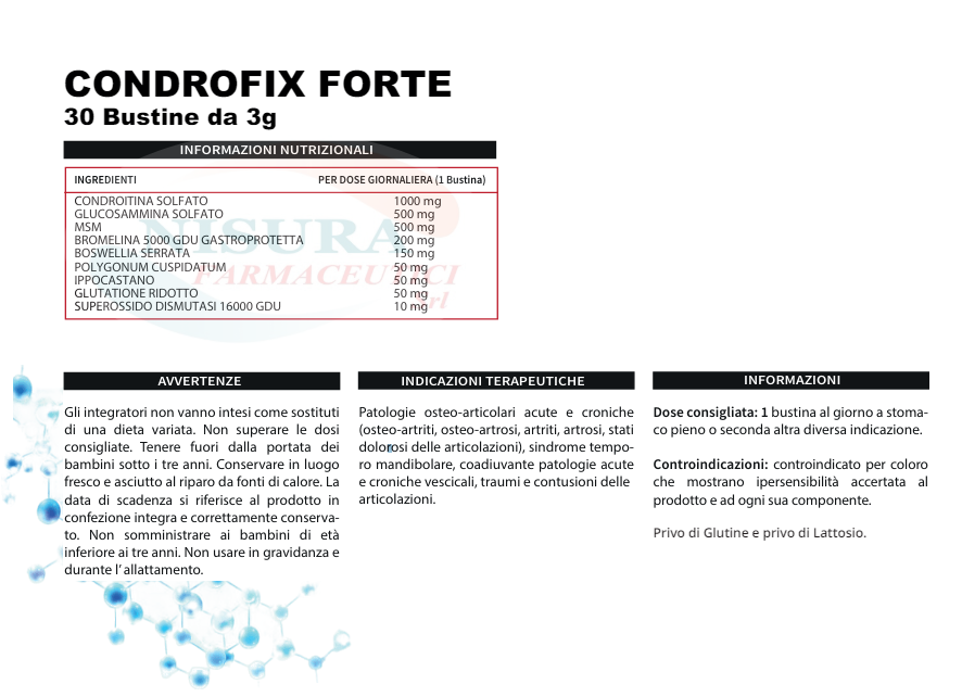 Ingredienti: Ingredienti: Condroitin solfato, Glucosammina solfato, MSM, Bromelina 5000 GDU Gastroprotetta, Boswellia serrata, Polygonium Cuspidatum, Glutatione Ridotto, Superossido Dismutasi 16000 GDU, 1ppocastano