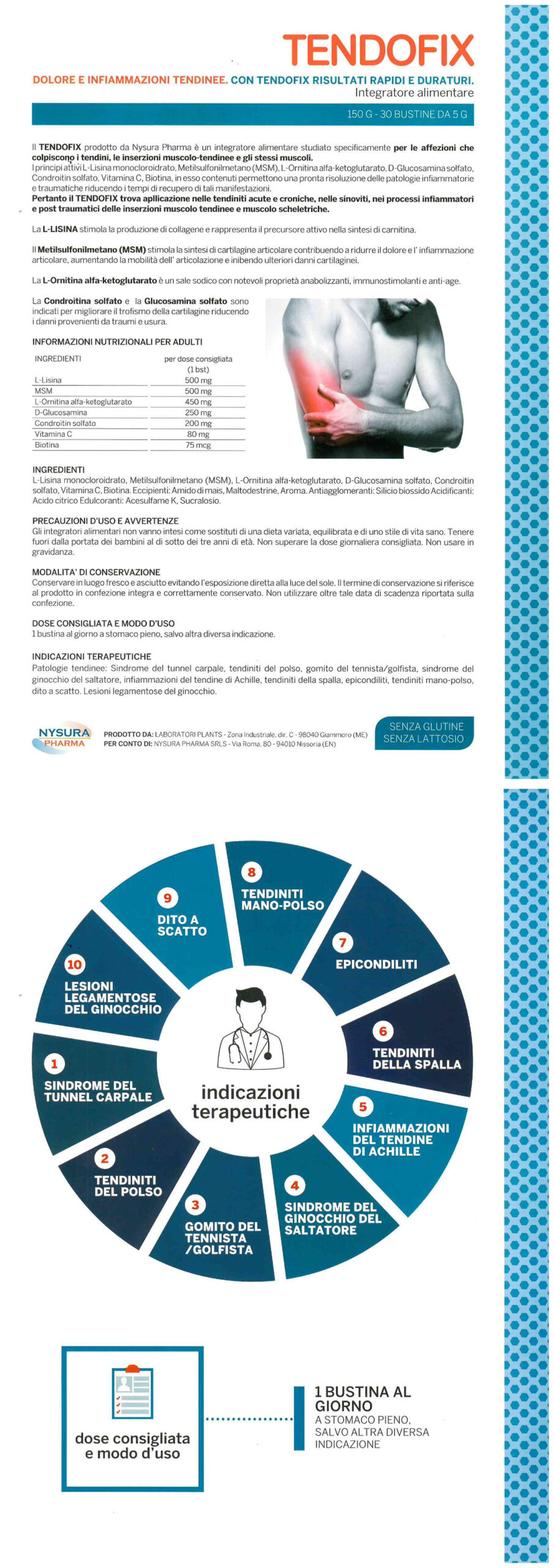 composizione: L-Lisina monocloroidrato, Metilsulfonilmetano (MSM), L-Ornitina alfa-ketoglutarato, D-Glucosamina solfato, Condroitin solfato, Vitamina C, Biotina.